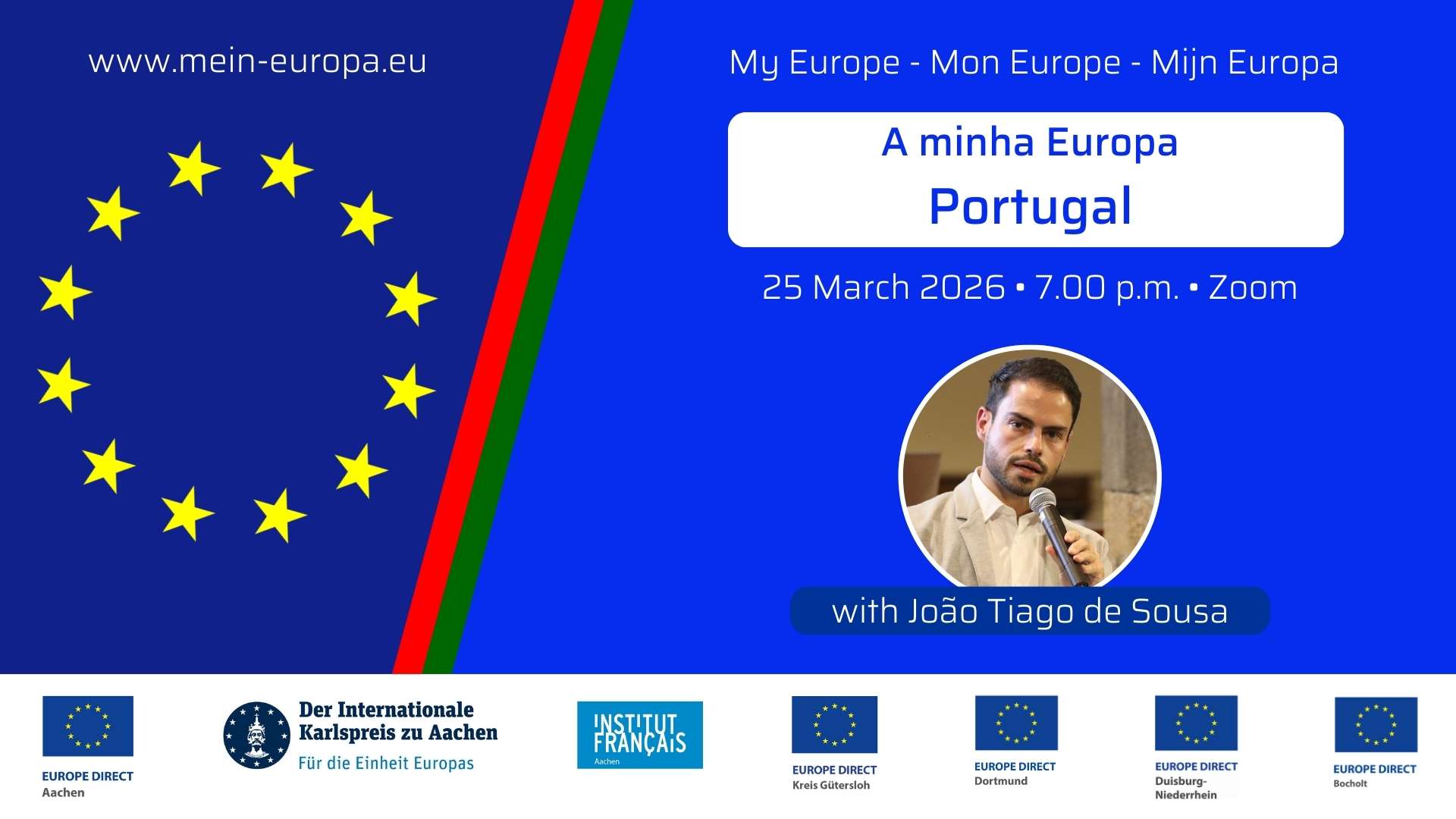 João Tiago de Sousa from Madeira takes the audience on a virtual journey to Portugal. He will discuss the recent elections in Portugal in English and provide insights into the Portuguese population’s public opinion of the EU. With regard to Madeira, he will present his commitment to the outermost regions of the EU. There will also be another interactive quiz on the focus country