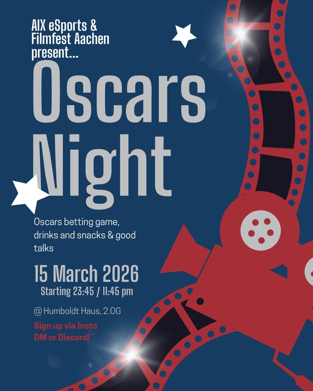 Join us and the Filmfest Aachen for the big Oscars Night! Enjoy a night full of movie banter, betting games as well as drinks and snacks. Join us starting at 11:45pm for the Red Carpet Countdown on the 2nd floor of the Humboldt Haus!