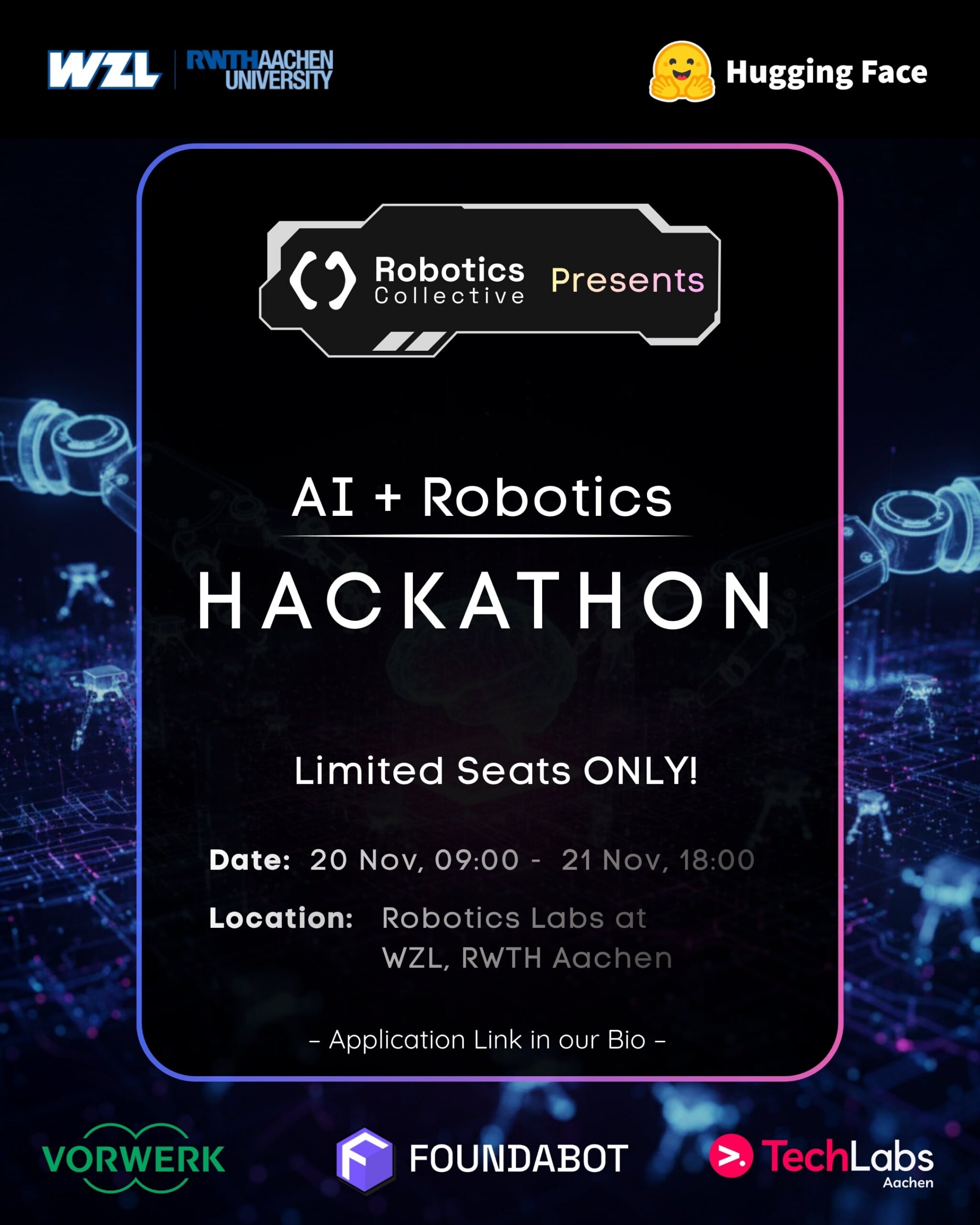 AI + Robotics Hackathon – ein zweitägiger innovativer Hackathon in Aachen, der Technikbegeisterte, Ingenieure und Forscher zusammenbringt, um unter fachkundiger Anleitung zu lernen, zu entwickeln und zusammenzuarbeiten und so die Zukunft der intelligenten Mensch-Roboter-Interaktion voranzutreiben.