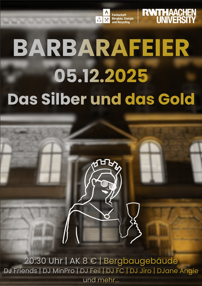 Die Fachschaft 5/1 richtet auch in diesem Jahr wieder ihre legendäre Barbarafeier zu Ehren der Schutzpatronin der Bergleute im Foyer des Bergbaugebäudes der RWTH aus. Am DJ-Set werden über den Abend verteilt Professoren und Mitarbeiter:innen von Instituten auflegen. Traditionell wird um Mitternacht gemeinsam das Steigerlied gesungen.