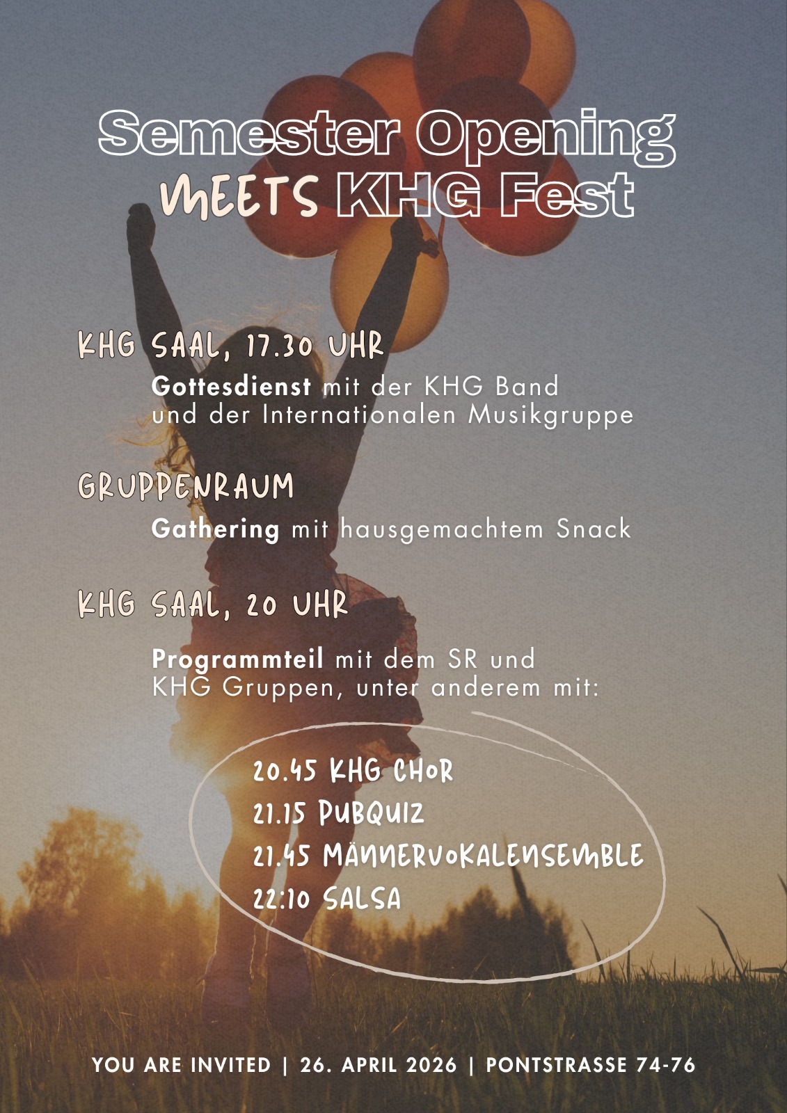 Zu Beginn des Sommersemesters findet wieder das KHG-Fest statt. Es soll eine bunte Feier unter dem Motto „Can’t steal my joy“ werden. Wir starten um 17.30 Uhr mit einem Gottesdienst. Anschließend gibt es um 19.00 Uhr für alle ein kostenloses Abendessen. Dann startet das Programm, an dem unter anderem der Aachener Studierendenchor der Katholischen Hochschulgemeinde, das Männervokalesemble Aachen und die Gruppe SoldelaSalsa beteiligt sind. Außerdem wird es ein PubQuiz, eine Cocktail-Bar und ganz viel Raum geben, um sich gegenseitig kennenzulernen. Wir freuen uns über jede*n, egal welcher Religion oder Konfession – ganz besonders über neue Gesichter!
