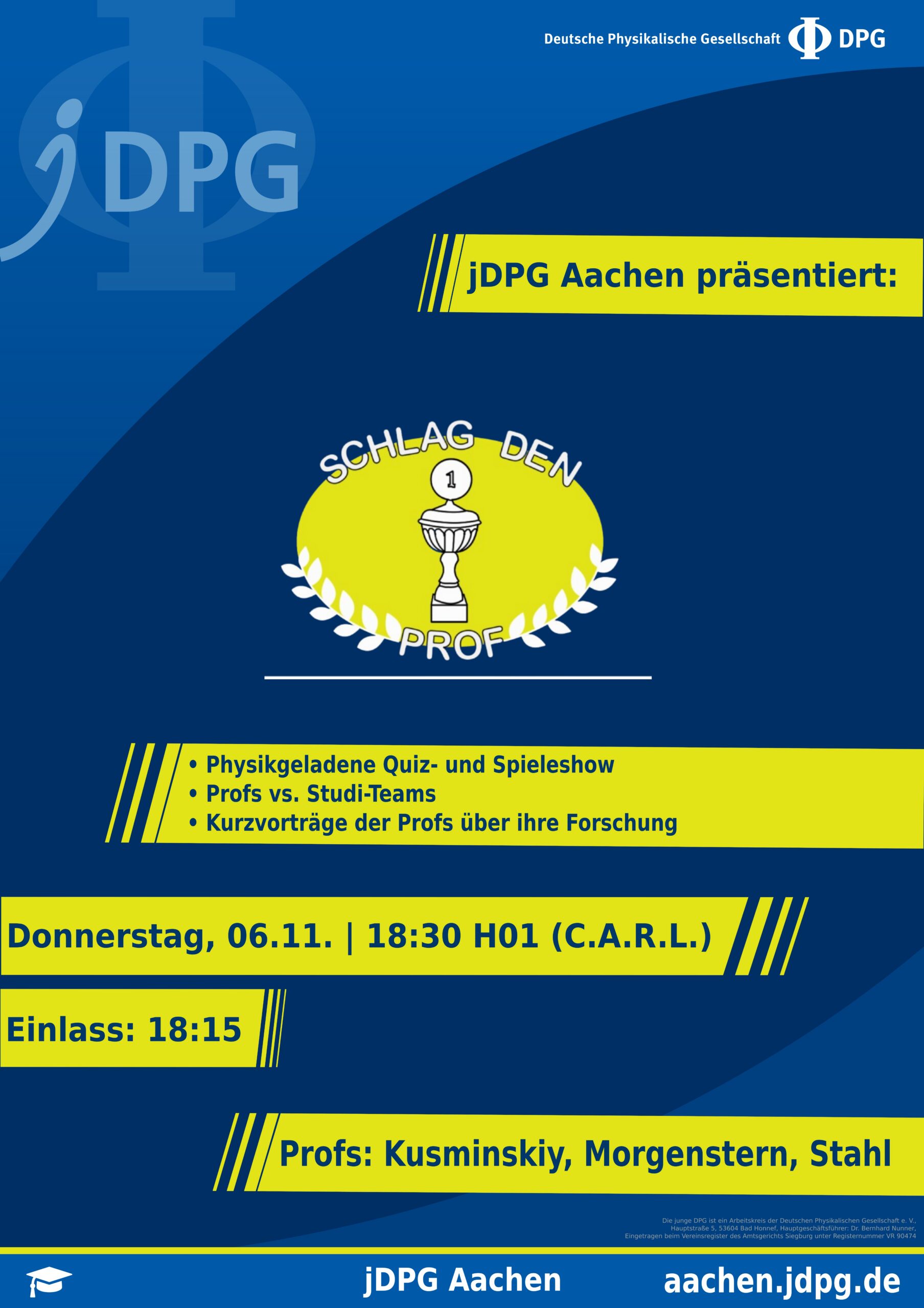 Hier findet ihr einen Bericht zu unser letztjährigen Veranstaltung: https://www.dpg-physik.de/vereinigungen/fachuebergreifend/ak/akjdpg/regional/rg-aachen/copy_of_schlag-den-prof