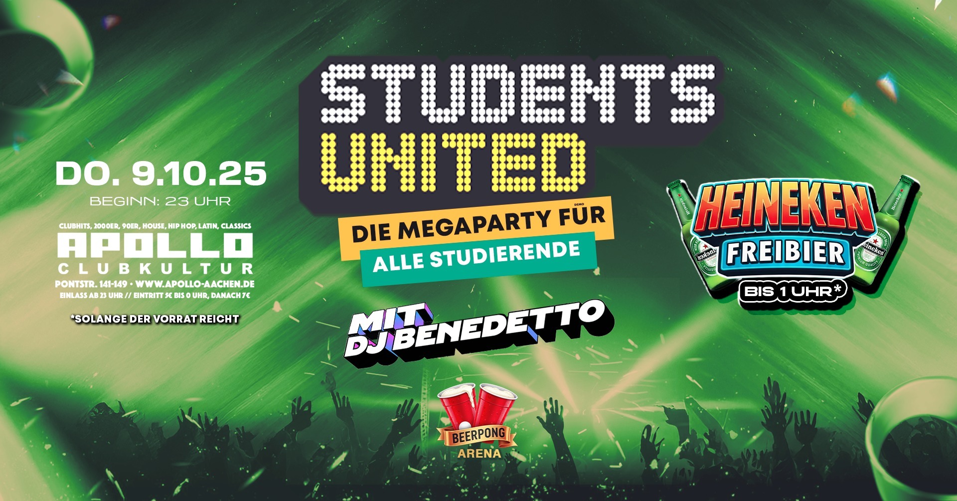 Anfang Oktober in Aachen: Die RWTH und Fachhochschulen erwachen langsam aus dem Sommerschlaf und überall tummeln sich neue Studierende. Die ersten Studierendengruppen ziehen mit ihren Tutoren durch die Stadt, um diese zu erkunden. Aachen ist eine Studierendenstadt und ihre Studierenden eine große Familie. Nun ist es an der Zeit, dass diese große Familie wieder zusammen feiert. Aus diesem Grund findet am Donnerstag, dem 9. Oktober, die große STUDENTS UNITED Party im Club Apollo in der Pontstrasse statt. Getreu dem Motto „We are family“ feiern hier alle Studierende, egal von welcher Hochschule, unter einem Dach. Und um die neuen Erstsemester standesgemäß in Aachen willkommenzuheißen, lassen wir es richtig krachen mit HEINEKEN FREIBIER bis 1 Uhr (solange der Vorrat reicht)