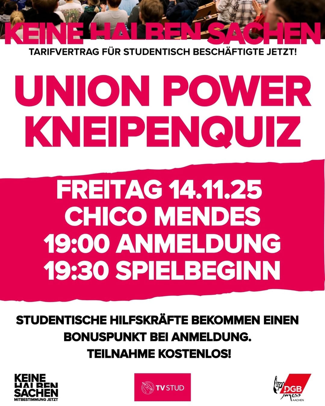 Keine Halben Sachen! Unser Union Power Kneipenquiz im Chico Mendes findet am 14.11 statt. Kommt vorbei, macht mit und gewinnt tolle Preise!